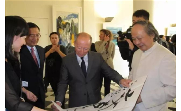 左起:唐应山、马汉智、李少平、刘佑局、大卫•卡枚欧、雷诺•道纳迪奥•德瓦布、陈文雄、赵美欧法国前文化部长雷诺·道纳迪奥·德瓦布、卢浮宫装饰艺术馆馆长大卫·卡枚欧、中国驻法国大使馆文化参赞李少平、巴黎市十三区副区长陈文雄、法兰西艺术协会主席高立昂(Jean-Francois)、法国著名华裔画家马泽霖、中国国家开放大学艺术学院院长唐应山、中国著名艺术设计大师吴峰华、清华大学文化产业研究员高润祥、著名银行家刘军、知名人士陈海燕、文艺评论家方向东、广东佑局书法艺术中心主任马汉智、策展人赵美欧、法国中文电视传媒董事长姜鸽以及各界人士300多人出席了开幕酒会。