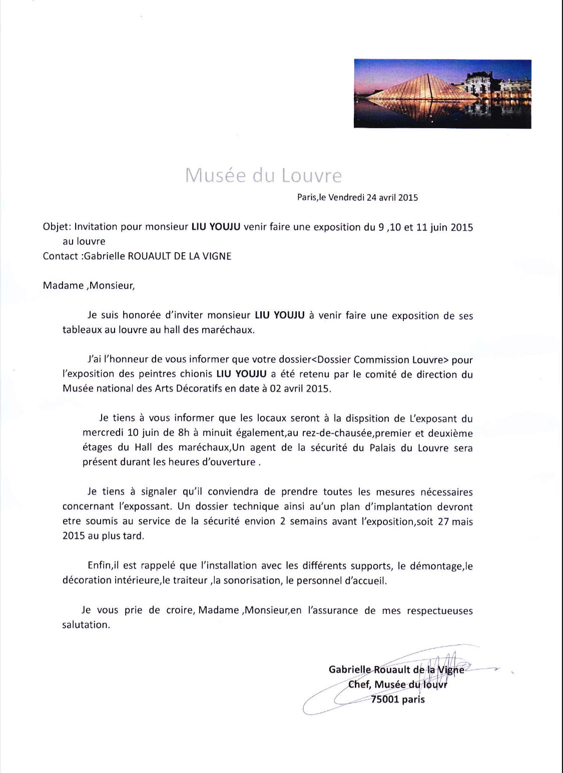 2015年4月24日,法国卢浮宫博物馆向中国当代艺术家刘佑局发出一封正式邀请函,邀请其参与于2015年6月9日至11日于卢浮宫元帅大厅(Hall des Maréchaux)举办的艺术展览。这封邀请函由法国国家装饰艺术博物馆(Musée national des Arts Décoratifs)管委会审核通过,并由卢浮宫馆长加布里埃尔·鲁奥(Gabrielle Rouault de la Vigne)正式签署。此事件不仅为刘佑局的艺术生涯确立了重要的国际性里程碑,也在当代中法文化交流的语境中构建起一次哲学性的审美对话。
