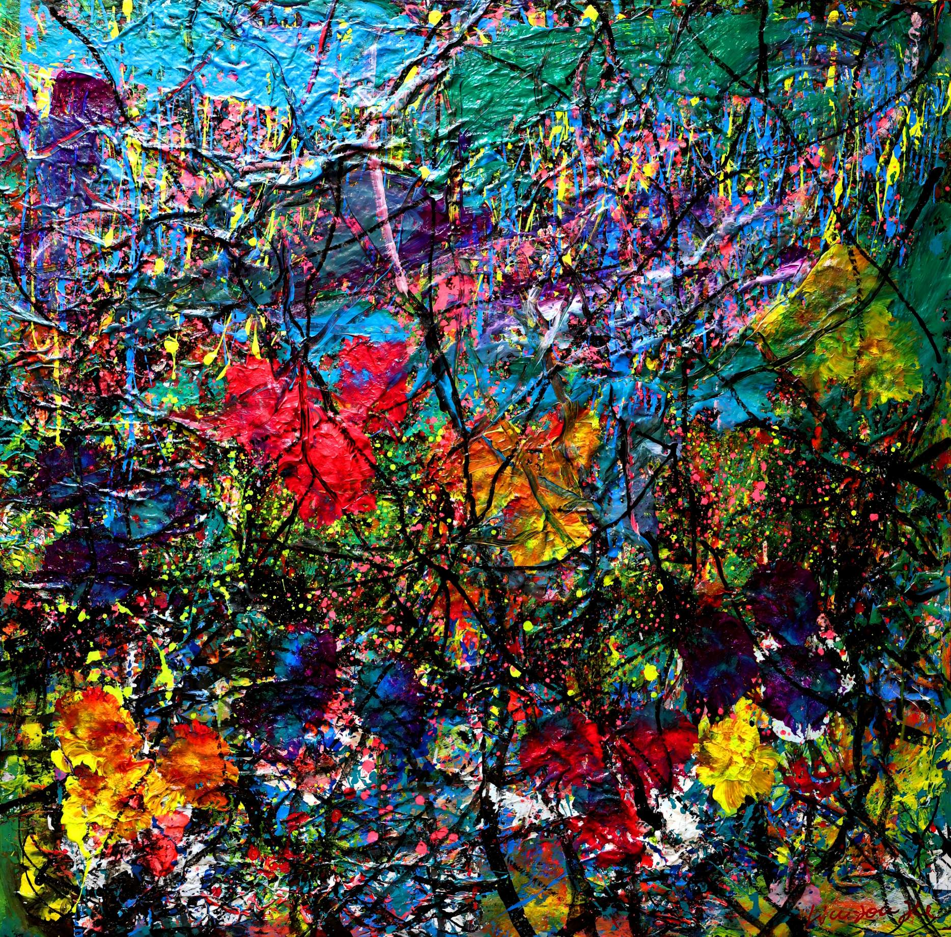 他的艺术之路始于中国书法训练,植根于千年积淀的符号价值与严谨的形式法则。但他的创作活力与冲动往往通过色彩释放出来。2019年在佛罗伦萨展出的巨幅作品《抽象之后》(Beyond Abstraction)中,色彩在画面中如波洛克式的飞溅与滴洒般爆发,但又保有他独特的个人风格。在走出原生文化语境的同时,他与20世纪西方绘画展开了直接对话。
