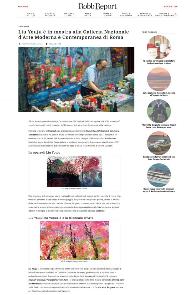 刘佑局的“有界与无界”罗马个展进入 Robb Report Italia,不只是个人艺术事业的里程碑,更意义在于:它揭示了中国艺术在全球文化网络中新的进入方式、表达方式与被理解方式。这不仅是一个展览的成功,也不仅是一篇报道的意义,它是中国文化软实力在国际高端文化体系中的一次现实呈现。