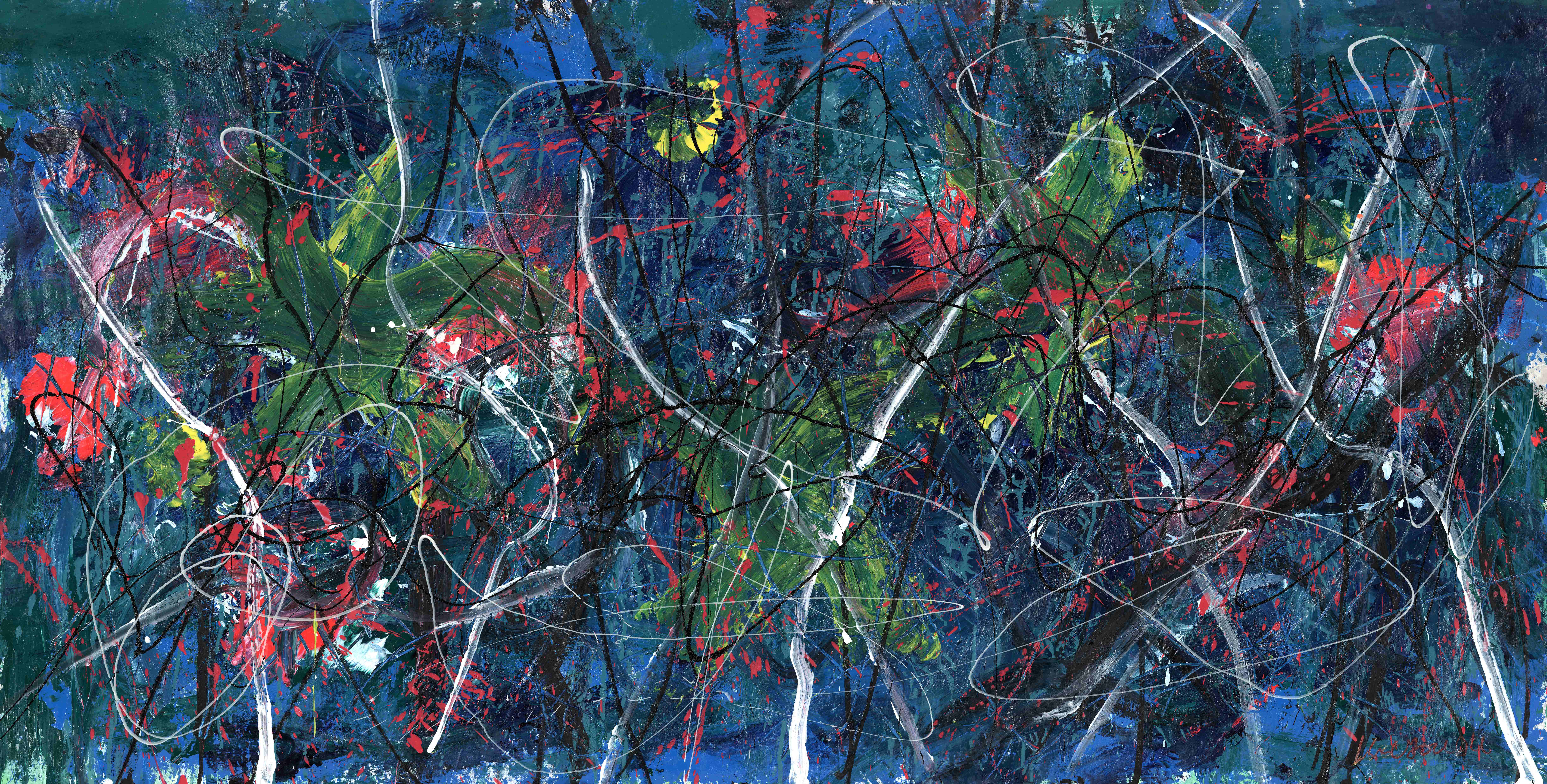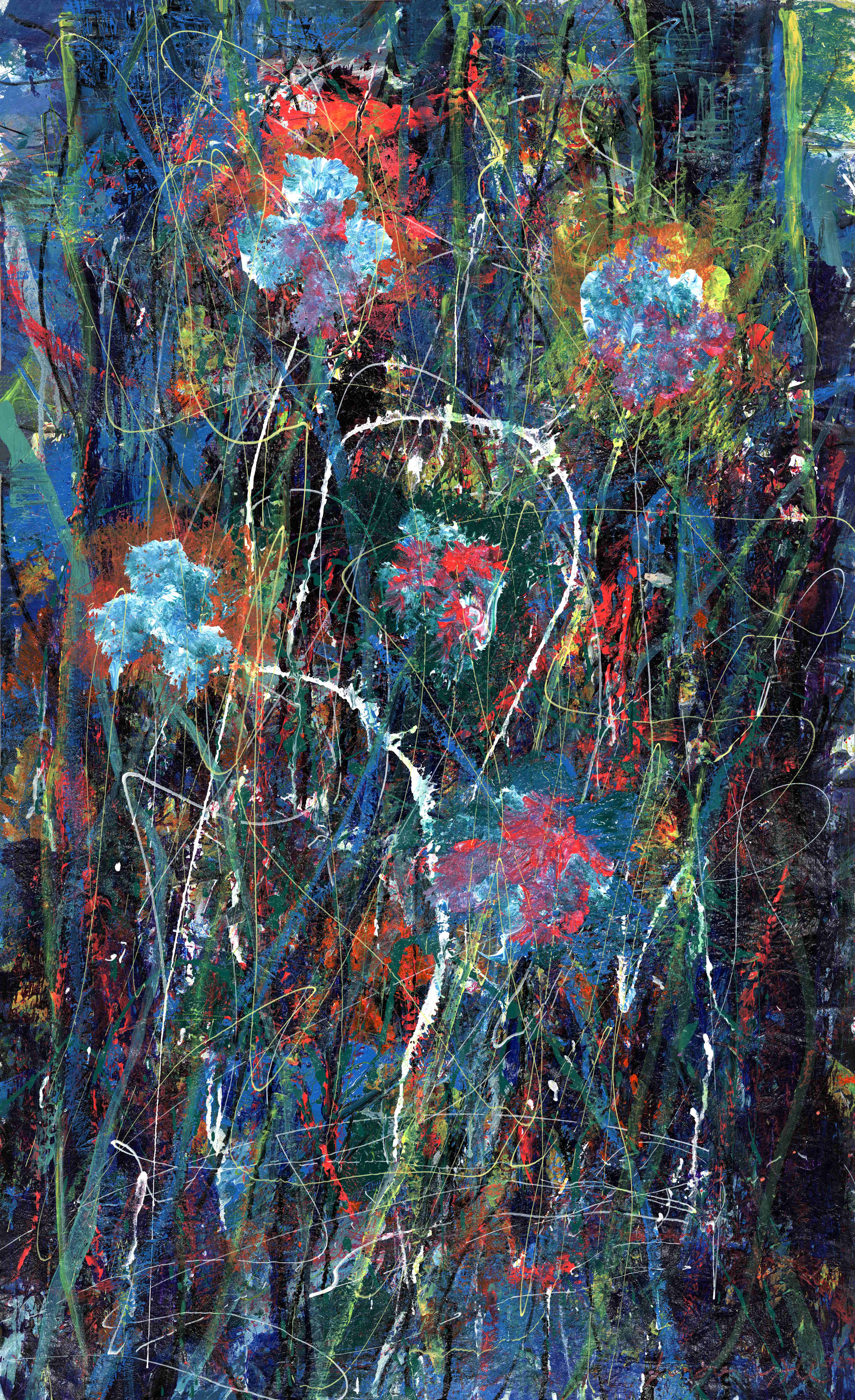 在《元韵织苍莽》《苍野》《野趣缠青冥》中,大面积的蓝绿构成如原野母体般的视觉背景。蓝象征宇宙的深域,绿象征自然的原生呼吸,二者融合成为生命得以孕生的能量场。而跳跃其中的红、黄、橙,则如星系爆裂的余焰,是生命萌发的火花,是原初能量喷薄的瞬间。在这些作品中,色彩具有“自发性”,它们从画面深处向外渗透,仿佛生命自身正在突破旧有结构,向世界发出第一声呼吸。