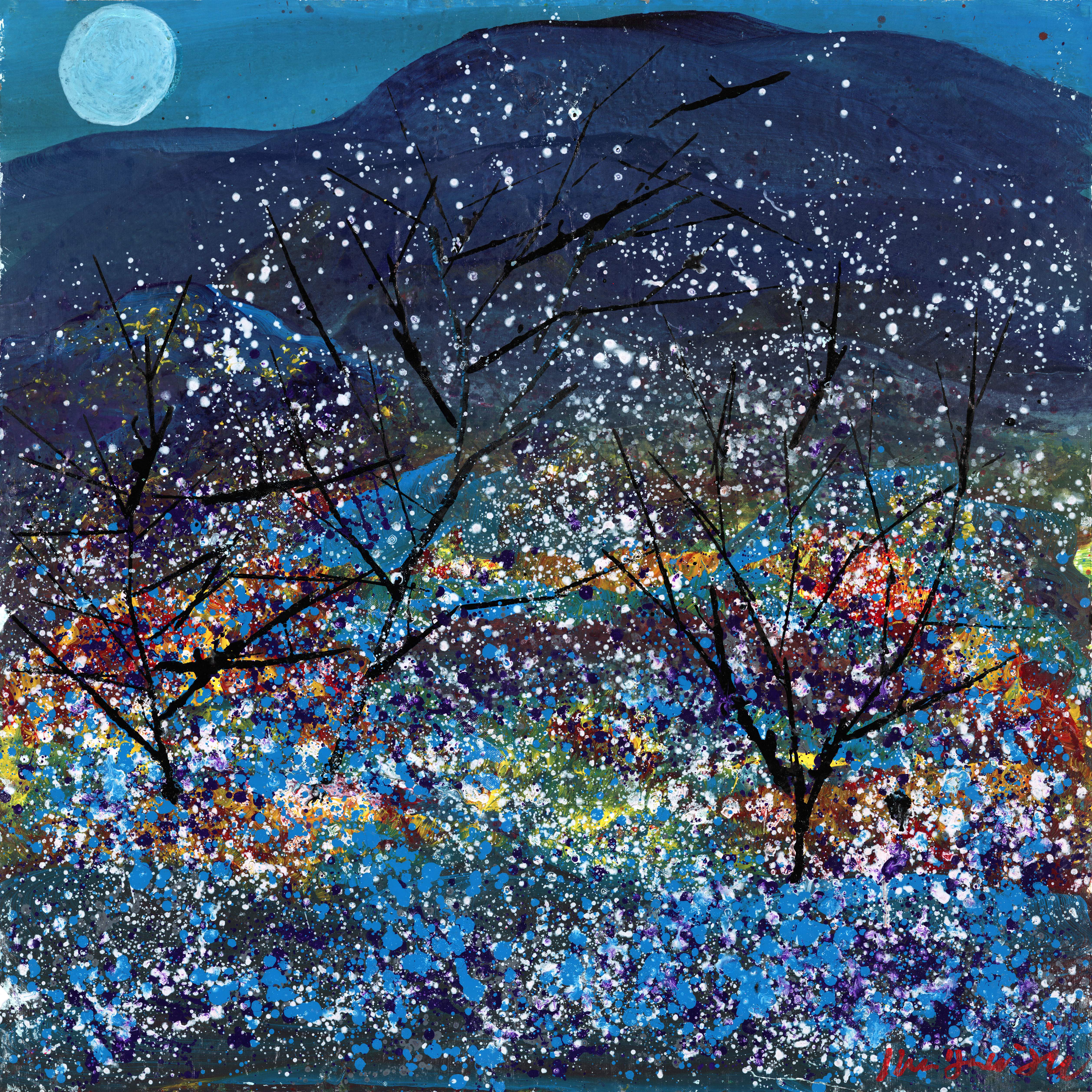 在这些作品中,花不是植物,而是能量的爆裂点;枝不是形体,而是生命意志的延展;星点般的彩色碎光则象征生命最微弱却最顽强的存在意志。画面呈现出一种“静中有动、动中显静”的生命哲学结构,揭示着生命在黑暗与光明之间不断生成的本质。